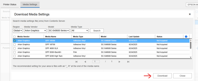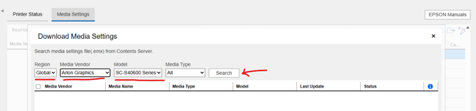 Select the parameter, Region: Global, Media Vendon: Arlon Graphics, Model: Your printer model, then select Search.